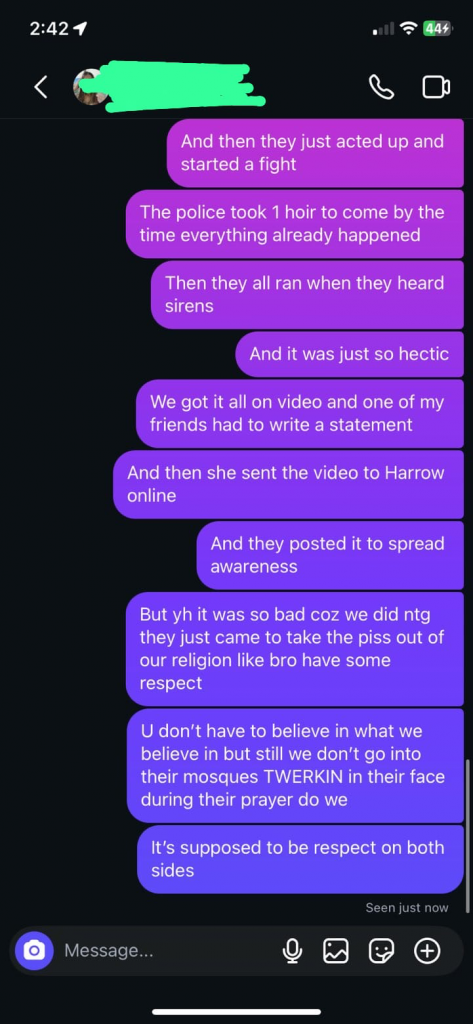 Shortly afterward 10 minutes, from the roadside of the Mosque, a larger group of approximately 15–16 youths approached the vicinity, creating further disturbance and terror by throwing glass bottles, sticks and other objects, causing fear among attendees and attempting to intimidate devotees. Our security personnel and volunteers acted responsibly to protect attendees and prevent escalation, ensuring the safety of those present. Our security personnel also got hurt.